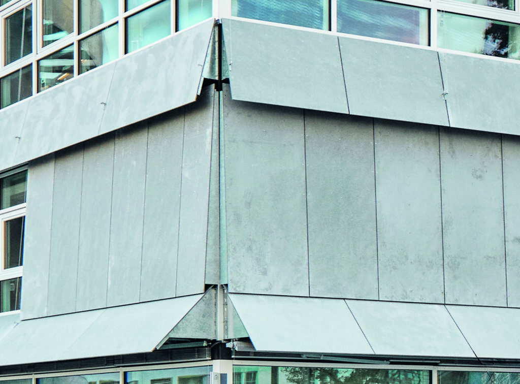 Montiert hat die Fassade die Firma Neba Therma AG aus Zofingen. Eine Besonderheit bei der Montage war, dass alle Fassadenplatten geneigt sind. Die einen mehr, die anderen weniger. Manche Platten ragen sogar wie kleine Vordächer hervor. Dafür wurden Schwerter aus feuerverzinktem Stahl gefertigt, auf die dann die Platten genietet wurden. Durch die unterschiedliche Neigung der Platten wird sich die Patina auch unterschiedlich schnell und stark entwickeln. Die Architektin Maya Scheibler sagt zu der Veränderung: «Das Material soll sich im Laufe der Zeit in den Ort einfügen und die Spuren der Zeit ablesbar machen.» Schon jetzt haben die Fassadenplatten kein einheitliches Grau mehr. Jede Platte altert unterschiedlich. Damit bekommt das Gebäude genau jene Ausstrahlung, die Architekten und Bauherrschaft sich für den Kreativpavillon gewünscht haben.