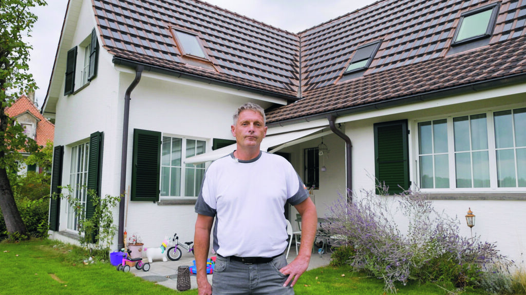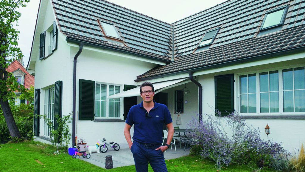 Mischa Perrenoud steht vor seinem Einfamilienhaus in Ittigen, blickt hinauf zum frisch modernisierten Dach und sagt: «Nach der Evaluation aller Möglichkeiten stach das PAN-System von Gasser Ceramic ganz klar als die beste Lösung heraus. Kein anderes Produkt erfüllte auch nur annähernd all unsere Bedürfnisse.» Doch von vorne: Nachdem die Perrenouds eine Erdsonden-Wärmepumpe installiert und sich ein Elektroauto zugelegt hatten, kam rasch der Wunsch auf, den eigenen Strombedarf selbst und nachhaltig zu produzieren. So weit, so klar. Doch die Suche nach einer geeigneten Solaranlage entpuppte sich als komplizierter als gedacht. Vor allem deshalb, weil die Dachstruktur des denkmalgeschützten Hauses stark verwinkelt ist und mehrere Dachfenster beinhaltet.