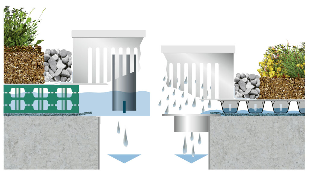 Es gibt zwei Varianten: Schwammdach mit reguliertem Ablauf (links) zur Kontrolle der Einleitmenge und Retentionsdach zur zeitverzögerten Ableitung bei Starkregen.
