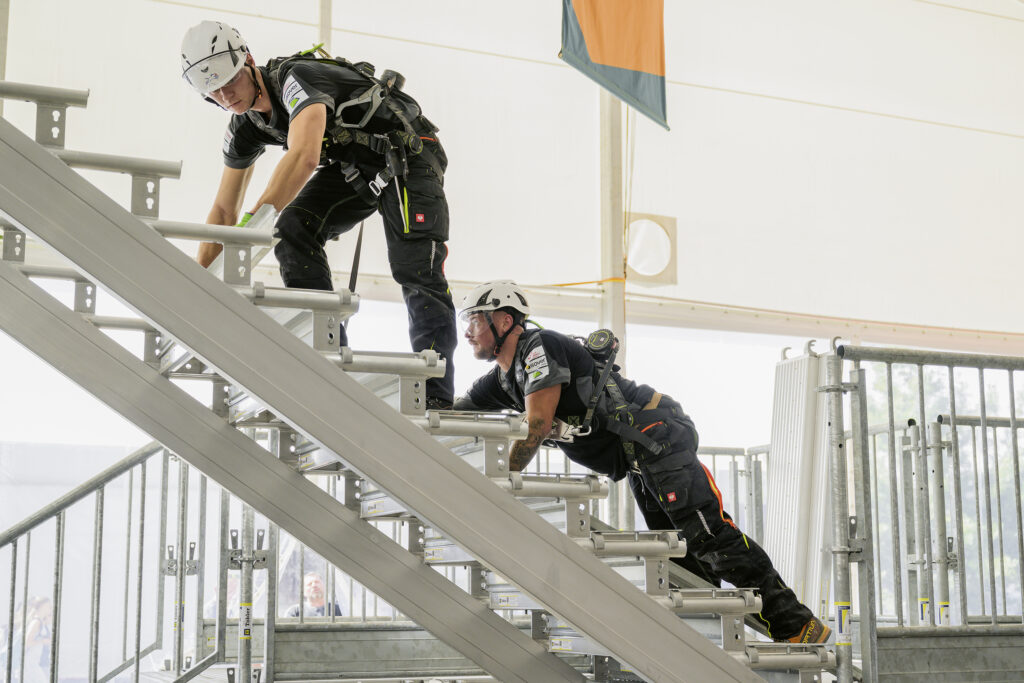 Gerüstbauer im Wettbewerbseifer – zügig, aber genau. So geht es «hoch hinaus». Eindrücklich zeigten die beiden, was sie können und wurden dabei vom Publikum angefeuert.