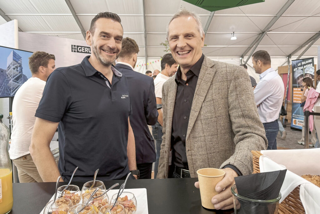 In der Begegnungszone der Halle 16 haben diverse Branchenapéros stattgefunden: Hier strahlen Roland Wächter, Verkaufsleiter Gebäudehülle Gebiet Mitte swisspor AG, und der Präsident von Gebäudehülle Schweiz, Arthur Müggler, um die Wette.