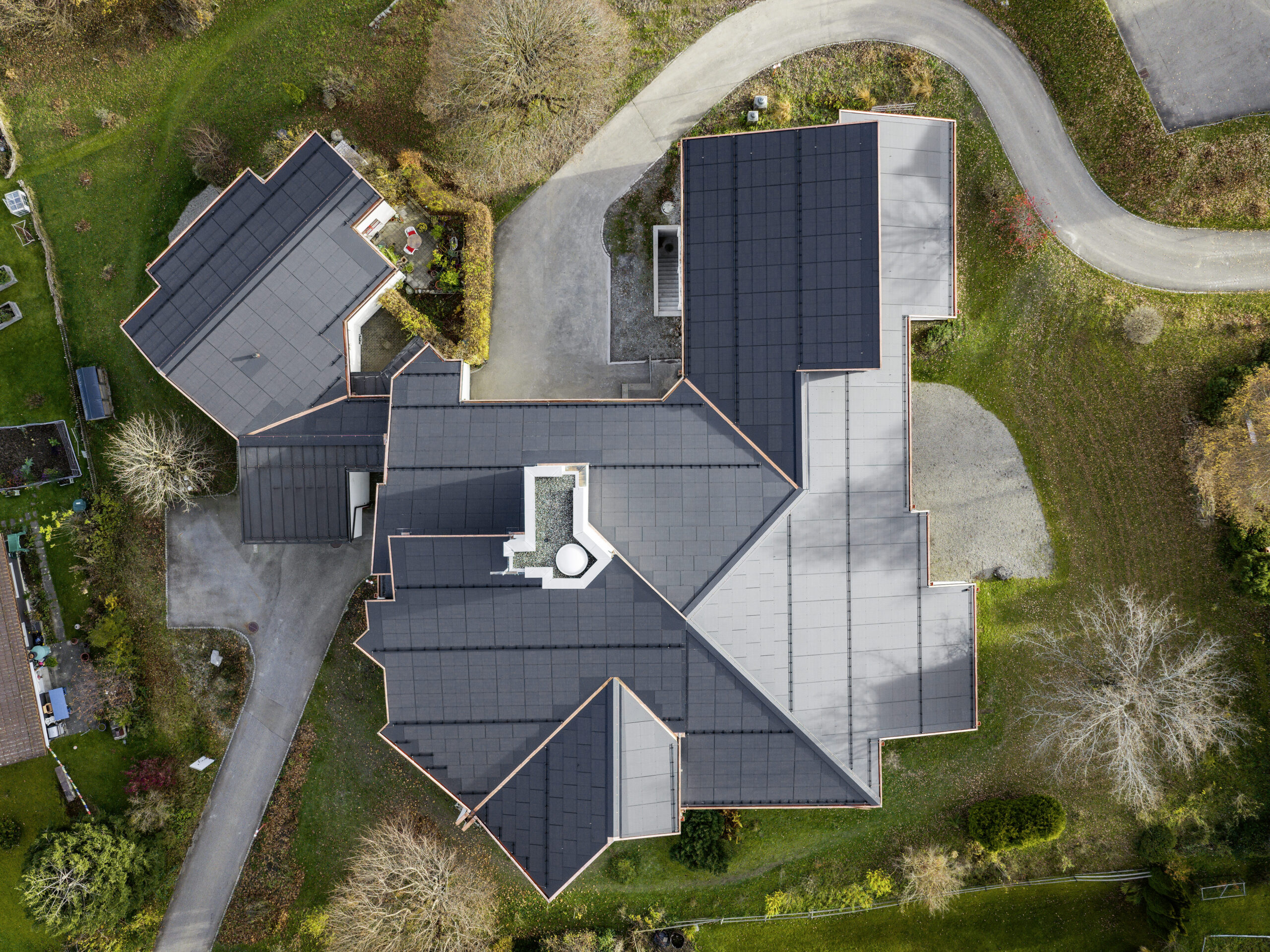 Wer sich das Dach aus der Vogelschau ansieht, erkennt schnell, dass das Projekt für die Architekten, die Dachdecker und Solarinstallateure keine 08/15-Aufgabe war. «Es gibt nur wenige rechte Winkel», stellt Thomas Walser von Schraner Partner Architektur nüchtern fest. So floss sehr viel Zeit und Sorgfalt in die Anordnung der Indach-Module. Dennoch mussten viele Details vor Ort justiert werden. Auch die Ergänzungsplatten wurden direkt vor Ort bearbeitet und in die passende Form gebogen.