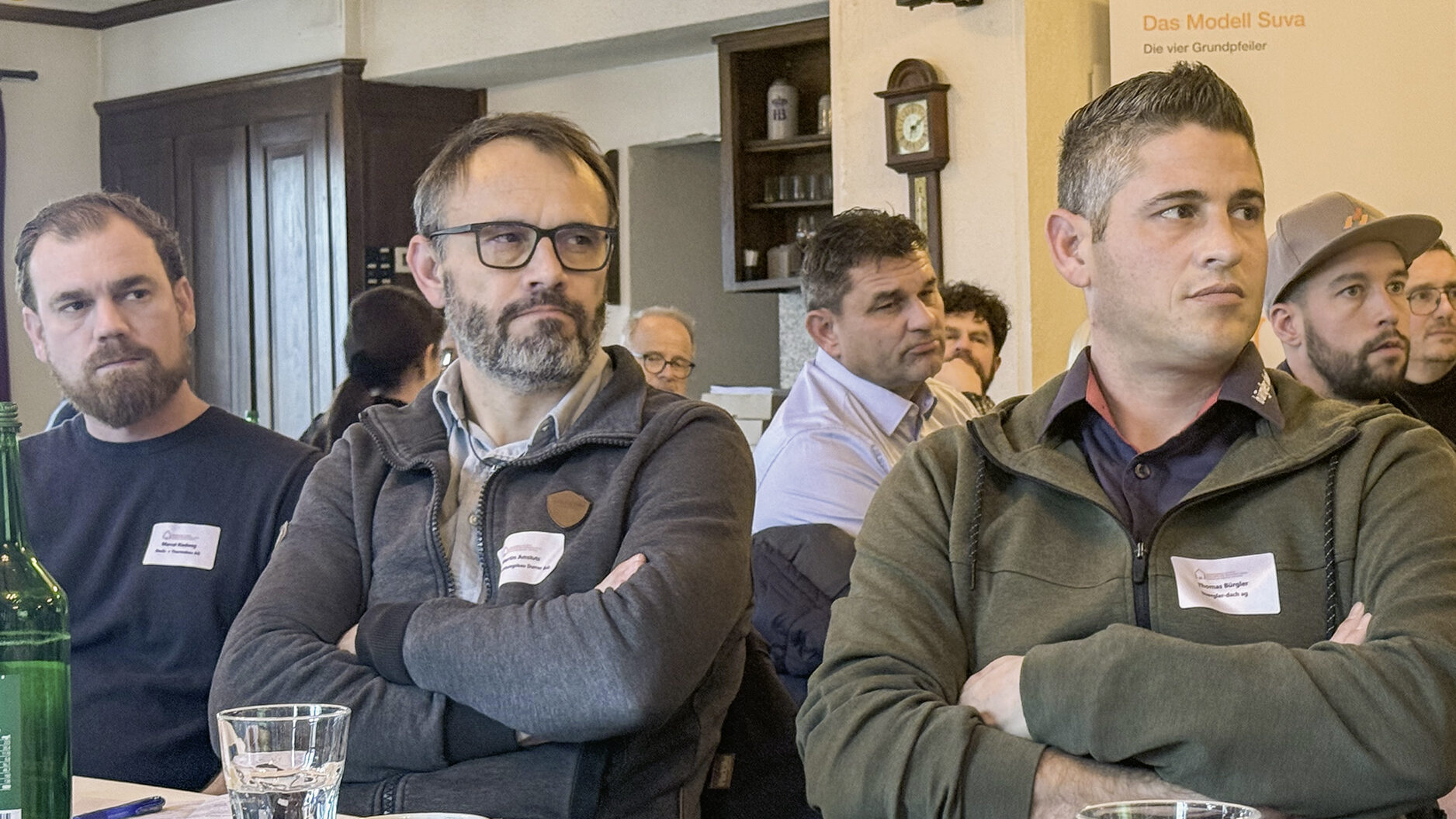 Abgeschlossen wurden die Infoveranstaltungen jeweils mit dem Thema Arbeitssicherheit und Gesundheitsschutz, präsentiert von Stefan Meister, dem Nachfolger von Tom van Egmond als Leiter Dienstleistungen, Arbeitssicherheit & Gesundheitsschutz. Er suchte nach Unterstützung beim Thema «Bauschadstoffe Flachdach auf Verdacht abklären». In Gisikon übergab Meister das Wort seinen Gästen von der Suva: Simon Erni vom Schadenmanagement und Urs Näpflin von der Präventionsberatung. Sie fokussierten sich auf ein Thema, das bei den Besuchenden auf rege Beteiligung stiess: Es ging darum, verunfallte Mitglieder während ihrer Auszeit an die Unternehmung zu binden und wieder einzugliedern, ohne Druck aufzusetzen. Die finanziellen Aspekte unfallbedingter Ausfälle und Wiedereingliederungen stiessen ebenfalls auf reges Interesse.